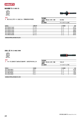 限位鑽頭 TE-C-HSC-B 應用 技術資料 ● 鑽出指定孔深的 HSC 錨栓孔時,需要使用的特殊鑽頭 注射器,安裝工具,附件,測試 限位鑽頭 器類型 插入連接頭 TE-C (SDS Plus) 四坑 安裝工具 TE-C-HSC-MW 應用 技術資料 ● HSC 安全錨栓進行自動自切底操作時,需要使用的安裝工具 注射器,安裝工具,附件,測試 安裝工具 器類型 插入連接頭 TE-C (SDS Plus) 四坑 喜利得網上購物平台: www.hilti.com.hk 285